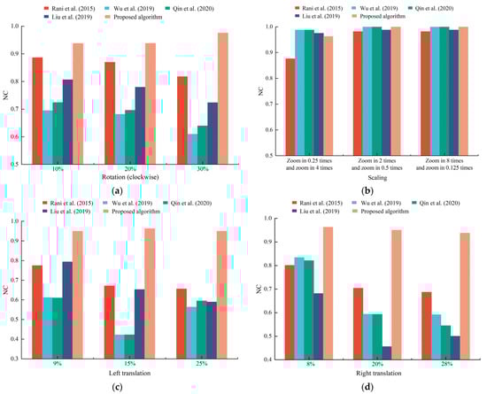 For geometric attacks, compared with the literature [2,14,15,18], the proposed algorithm has a greater degree of enhancement, especially in rotation attacks, translation attacks, and cropping attacks. Figure 17 demonstrates that for rotation attacks at different angles, the proposed algorithm consistently achieves higher NC values than the literature [2,14,15,18]. When rotating 20% clockwise, the algorithm in this paper still maintains the NC value of around 0.95, and the NC values of other documents are lower than 0.9; even the NC values of the literature [14,15] are only about 0.65, which is less robust. For translational attacks, the NC values of other algorithms have a rapid downward trend, while the algorithm in this paper changes slowly, and the minimum NC value is greater than 0.92. For cropping at different positions, for small parts of cropping, the NC values of the five algorithms can be equal, but when the cropping part is larger, the NC value of the algorithm in this paper is improved, compared to the literature [2,14,15,18], around 5–15%.