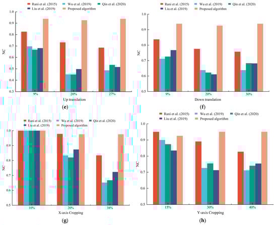 Comparison of the robustness of different algorithms under geometric attacks: (a) rotation; (b) scaling; (c) left translation; (d) right translation; (e) up translation; (f) down translation; (g) X-axis cropping; and (h) Y-axis cropping.