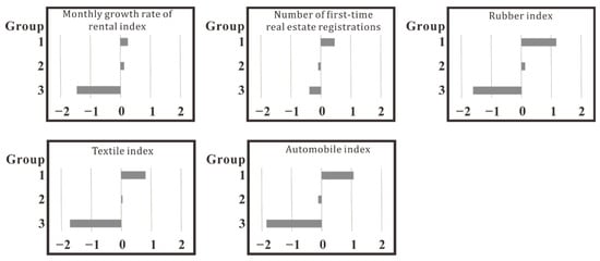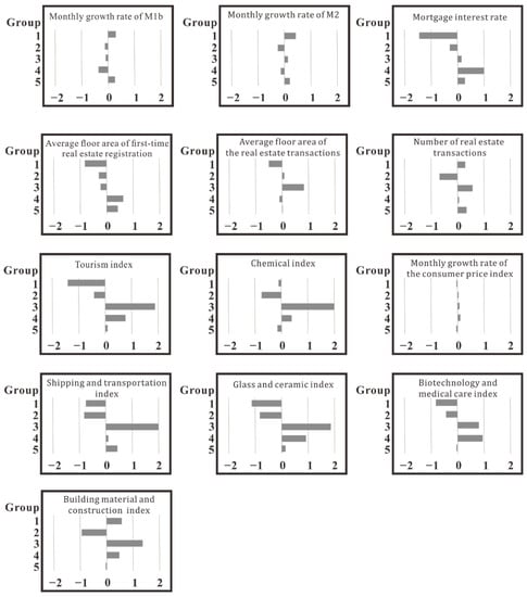 Figure 1 illustrates the clustering results based on 13 indexes related to trends in money supply using DBM-PSO. The clustering of five groups provided the optimal sum of intracluster distances within all clusters compared with other numbers of clustering groups. Each bar indicates the average of the clustered samples in an index related to money supply. The positive and negative numbers are the high and low numbers in an index. The results revealed that the clustering results were similar in terms of the mortgage interest rate, average floor area in first-time real estate registration, tourism index, chemical index, shipping and transportation index, glass and ceramic index, and biotechnology and medical care index. The average floor area in real estate transactions was correlated with these six stock indexes, as illustrated in Figure 1. The results demonstrated that the average floor area of the first real estate registration and average floor area of properties were highly correlated with mortgage interest rates. With a monthly growth rate in M2, the real estate transaction volume increased. Therefore, an increase in mortgage interest rates increased the average floor area of transaction properties, and a decline reduced the average floor area.