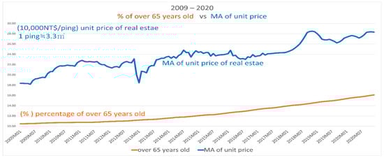 Our results revealed that population size affected real estate and reaffirmed the conclusions of other studies. Otto demonstrated that population growth had a significant positive effect [], Takáts noted that demographics significantly affected real house prices, and Tsai et al. identified population density to be a key factor affecting house price spread []. Furthermore, the present study revealed that the average unit price of real estate transactions influenced by population was higher than the number of real estate transactions and the average floor area of real estate transactions. Bensdorp demonstrated that the effect of demographics on real estate was significant []. Older people accumulate wealth during their lifetime and spend more on housing. Although they do not require a large house, they require a comfortable house. Therefore, the average unit price of real estate transactions influenced by population was higher than that of other prices. This study divided the population into three groups based on age. Our results demonstrated that different population age groups had different effects on real estate. The monthly growth rate of the >65 population was more likely to affect the average unit price of real estate transactions than that of other age groups. Wang and Kinugasa demonstrated that a 1% increase in the old-age dependency ratio led to a 5.51% increase in house prices [], and Gevorgyan revealed that when the population increased by 1%, house prices increased by 1.4% []. The older adult population can influence real estate positively; for example, it affects stock markets, including those linked to the food, power, electrical, electronic components, electronics, financial and insurance, information services, and semiconductor industries.