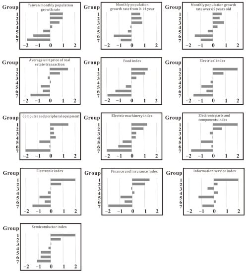 The following 13 indexes were closely related to population: (1) Taiwan’s monthly population growth rate, (2) the monthly population growth rate of people aged 0–14 years, (3) monthly population growth rate of people aged > 65 years, (4) average unit price of real estate transactions, (5) food index, (6) electrical index, (7) computer and peripheral equipment index, (8) electric machinery index, (9) electronic parts and components index, (10) electronic index, (11) finance and insurance index, (12) information service index, and (13) semiconductor index.
