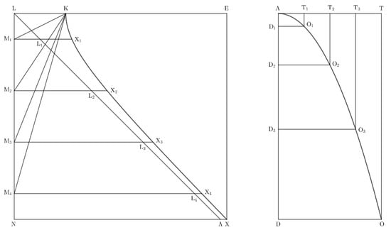 Then, Wallis joined and to the ordinates applied to the diameter of the hyperbole and the triangle of Figure 5 [9] (pp. 554–555). In this way, he set up a correspondence between the length of the arc of the parabola, the area of the hyperbole, and the area of the triangle.