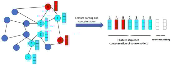 According to the generated depth chained adjacency matrix (N_DCAM) and depth walk sequence () in Section 3.1, we need to sort and concatenate the sparse features of the source nodes. The specific process is shown in Figure 4.