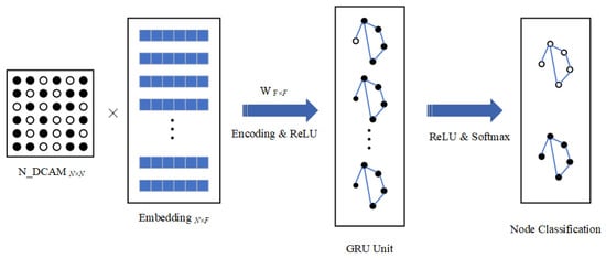 It can be seen from Figure 4 that the red nodes represent the first-order neighbor nodes of source node 1, and the blue nodes represent the biased random walk nodes of source node 1 (DFS depth search strategy). The purpose of feature sorting is to construct the time series features of the source node, which is convenient for the GRU unit to perform dependent feature extraction. The feature concatenation length of the source node is . The GRU message transmission model is as follows: