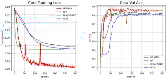 Comparison of training error and validation accuracy of GCN, GAT, GraphSAGE, and GR-GNN on the Cora dataset.