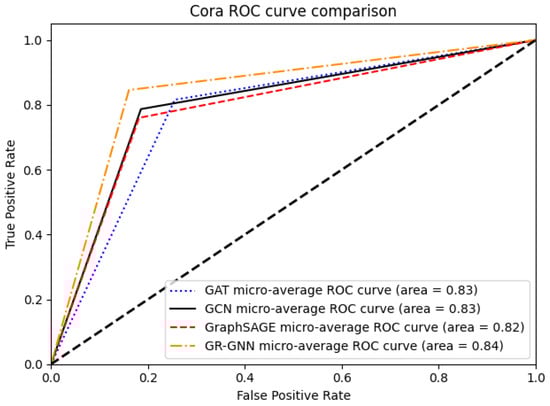 In addition, in order to reflect the training effect of the model during training and validation, the training set loss and validation set accuracy were collected during the training process, respectively. Using the Cora dataset as an example, the comparison results of the training set loss and validation set accuracy of GCN, GAT, GraphSAGE, and GR-GNN are shown in Figure 6. The ROC curve can well represent the performance and accuracy of the model. The ROC curve of the validation set is shown in Figure 7.