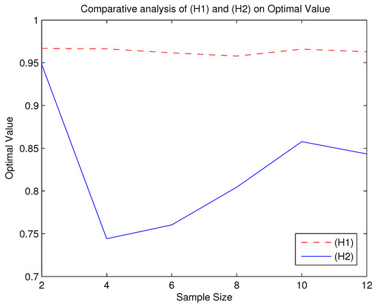 From the Table 3 and Table 4 and Figure 1, Figure 2, Figure 3, Figure 4 and Figure 5, we can roughly see that problems () and () can be solved by the alternating iteration algorithm. We know from Figure 1, Figure 2, Figure 3, Figure 4 and Figure 5 that when using the algorithm to solve () and , the number of iterations and time of solving are basically more than that of solving (). Moreover, the optimal values of is smaller than the ones of (). Since the DRO model is usually used to describe an upper bound of uncertain optimization problems, the smaller the optimal value of the DRO model, the less conservative the DRO model is. Therefore, is a less conservative DRO model. However, according to Figure 3, () is more robust than because the curve shown by () is more stable.