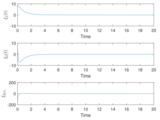 Corresponding to the sliding term (3), these coefficients are chosen as , , and thus the sliding surface is obtained as . The NN corresponding to (11) is set to have 12 neurons, and the centers are also evenly spaced from to 6.
