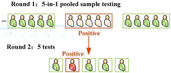 The principle of “five-in-one” pooled testing is shown in Figure 2. The samples collected from five people are mixed before testing. If the result of the pooled sample is negative, all five samples in the set are negative, i.e., the five people in the pooled sample are safe. On the contrary, if the pooled sample yielded a positive result, the five people are notified as soon as possible. Those people are immediately isolated and tested separately to identify the positive sample. “Five-in-one” pooled testing saves both time and costs and reduces sampling inspections, thereby reducing the workload of the health sector. Especially in large cities such as Beijing, Wuhan and Qingdao, each of which has over 10 million people, pooled testing can be relied on for the general prevention-oriented coronavirus nucleic acid screening. Pooled testing can be promoted when coronavirus activity in the sample and nucleic acid testing sensitivity are not affected by dilution. According to research conducted by the Institute of Virology of Saarland University in Germany, the method of “pooled samples” can merge up to 30 samples, which is sufficient to ensure testing accuracy, although testing sensitivity is slightly reduced. Since the PCR testing initially needs to be amplified, the dilution has almost no effect on the testing results. However, the actual pooled sample ratio should be controlled at 5–10 people, and the maximum should not exceed 20 people, to ensure that the testing sensitivity does not decrease [].