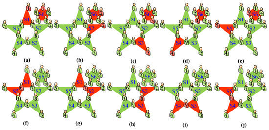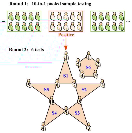 Since pooled testing is suitable for areas with low infection rates, a high number of individuals who are positive in the random “ten-in-one” testing is a small probability event from a probabilistic point of view. That is, if a “ten-in-one” pooled testing result is positive, the greatest probability is that only an individual person is infected. Therefore, the pentagram mini-pooled testing (see Figure 4) proposed in this paper focuses on the circumstance in which only one specimen is infected among the ten specimens of the positive pooled sample. As mentioned above, when a “ten-in-one” pooled testing is positive, the ten people should be isolated and retested in a second round. Pentagram mini-pooled testing works as follows in the second round. Before testing, the people are sorted from one to ten, and two throat swab samples are collected from each person. During testing, the twenty swabs are pooled into six samples according to the pentagram mini-pooled testing method (five “three-in-one” pooled samples (S1–S5) and one “five-in-one” pooled sample (S6), as shown in Figure 5)). Every three specimens are placed in the same collection tube according to the three serial numbers corresponding to the vertices of the five orange triangles of the pentagram. For example, one swab sample is taken from subjects 1, 6, and 7, and these three swab samples are placed into the S1 collection tube for the “three-in-one” pooled testing. By analogy, S2–S5 collection tubes are obtained. The “five-in-one” pooled sample tube (i.e., S6 collection tube) refers to the collected swab samples from subjects 1 to 5. Nucleic acid testing is then performed for the six pooled samples (S1–S6). After the testing samples are returned, the positive patients are identified by comparing the prediction testing results, as shown in Figure 5.