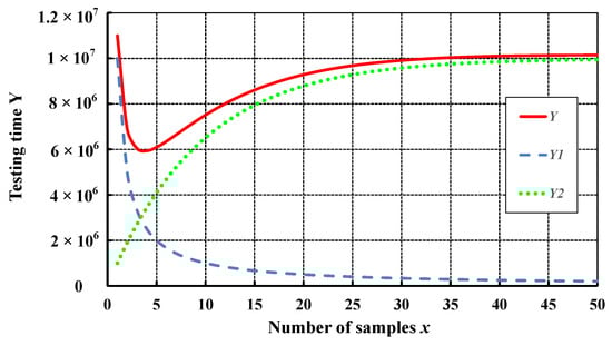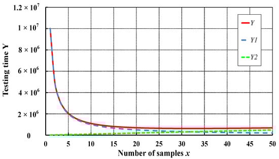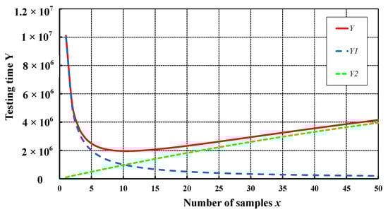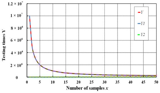 As can be noticed, the total testing time Y, as shown in Figure 10, initially decreases rapidly. This is because when the number of sets is small, the first round of set testing time N/x dramatically reduces the total testing time. Since the number of samples x is small, the testing time for positive sets in the next round remains relatively small. Therefore, the second-round testing time Y2 in the total testing time Y is relatively small. On the contrary, when the number of samples x is large, the value N/x significantly reduces the testing time. However, the testing time of positive sets in the second round also increases significantly as it becomes exponential, which adds to the total testing time. Therefore, there is a reasonable value range for the number of samples x under different infection rates p. From Figure 5, it could be observed that, as the infection rate p increases, the most reasonable number of samples x decreases.
