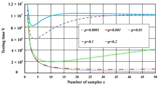 From the above, it can be concluded that, as the infection rate p increases, the testing time Y2 in the second round increases dramatically, which significantly affects the total testing time Y. The value Y is plotted when the infection rate p is 0.0001, 0.001, 0.01, 0.1, and 0.2 to analyse the relationship between the total testing time Y and the number of samples x under different infection rates p (see Figure 10). When the infection rate p is low (p ≤ 0.001), as the number of samples x increases, the total testing time Y drops sharply. However, as the number of samples x continues to increase, the total testing time Y stabilises. Figure 10 shows that a further increase in the number of samples x when p ≤ 0.001 barely reduces the testing time. When the infection rate p increases (p ≥ 0.01), it can be noticed that, as the number of samples x increases in the initial stage, the total testing time Y decreases significantly. However, as the number of samples x continues to increase, the total testing time Y increases until it approaches or exceeds the total testing time if the traditional individual-sample testing is used. Consequently, pooled testing is not efficient in these situations.