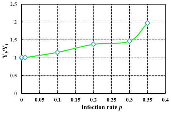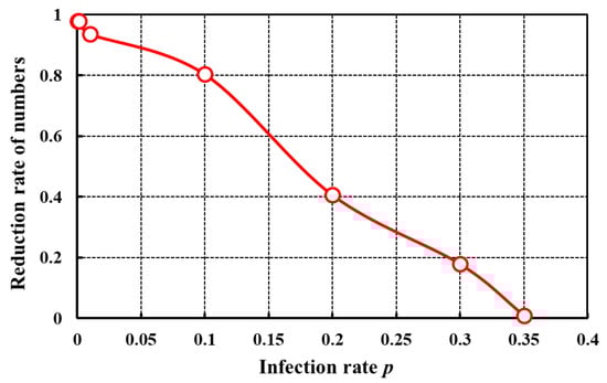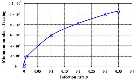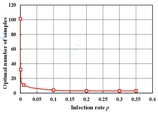 Currently, Figure 11 provides the optimum number of samples relative to the infection rate. Additionally, the minimum number of testing samples against the infection rate is illustrated in Figure 12. The ratio between the second-round testing time to that of the first-round testing is provided in Figure 13, while Figure 14 shows the relationship between the reduction rate relative to the individual-sample testing corresponding to the infection rate. From Figure 11, it is obvious that, when the infection rate p is minimal, the value of x (assumed to be the optimal value) corresponding to the minimum value of Y is increasing. As the infection rate p gradually increases, the number of samples x gradually decreases. When the infection rate p reaches 0.01, the “eleven-in-one” pooled testing method becomes the most useful testing method. When the infection rate p = 0.1, only the “four-in-one” pooled testing method can be used to reduce testing times. As the infection rate p increases, the corresponding minimum testing times also increase (see Figure 12). As the infection rate p increases, the value of Y2 increases sharply. The proportion of testing times in the second round also increases distinctly compared to that of the first round (see Figure 13). In addition, from Figure 14 it can be noticed that, as the infection rate p increases, the advantages of pooled testing compared with those of individual-sample testing gradually decrease. When the infection rate p is low (e.g., when the infection rate is 0.001), the pooled testing method should be used, which reduces the total testing time by more than 90% compared with individual-sample testing. When the infection rate p is 0.01, the “eleven-in-one” pooled testing method is adopted, which reduces the total testing time Y by 80.44%. When the infection rate p reaches 0.3, the pooled testing times are close to that of individual-sample testing, and the reduction rate compared to individual-sample testing is minimal. As the infection rate p further increases, the total time required for pooled testing surpasses that of individual-sample testing, which increases the sampling and testing costs. Therefore, pooled testing has significant advantages over individual-sample testing when the infection rate p is low; however, with increasing infection rate, testing efficiency gradually decreases, and its advantages further decrease. This also theoretically explains why the “ten-in-one” pooled testing method was used in Qingdao, while the “five-in-one” pooled testing method was used in Wuhan. Specifically, the infection rate p in Qingdao was low, and the use of “ten-in-one” pooled testing significantly reduced the testing times. Therefore, it took only five days to conduct nucleic acid testing on more than 10 million people. On the contrary, due to the higher infection rate in Wuhan, the “five-in-one” pooled testing method was adopted with fewer combinations. From the above discussion, it could be concluded that, when the infection rate p is low, pooled testing has undeniable advantages. However, as the infection rate p increases, its testing advantages gradually decrease. When the infection rate p reaches a certain value (p > 0.3), pooled testing becomes no longer applicable. However, COVID-19 continues to spread around the world. Before the vaccine is developed and widely used, nucleic acid testing and screening for infected persons is still one of the most effective control measures. Therefore, in regions with few infected people, earlier pooled testing should be adopted to reduce the numbers and time required for nucleic acid testing, which is beneficial for controlling COVID-19. On the contrary, higher infection rate increases testing times, and the dramatic increasing trend increases the difficulty and cost of testing.