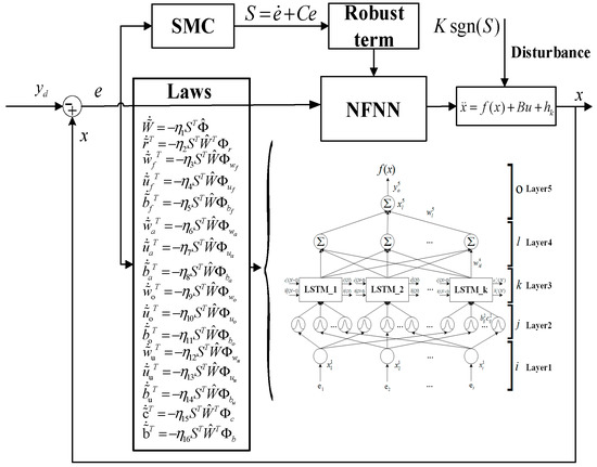 Figure 3 gives the block diagram of the designed ASMC-NFNN, which mainly includes three parts: reference signal, proposed controller, and dynamic system. In the controller module, the NFNN took the error information of the system as input, used the gradient descent method for optimization, and adaptively learnt in order to obtain the unknown uncertainty of the system; SMC as the main body of the controller, combined with the estimated value output by the NFNN and robust term, gave the final effective control law. In addition, the control object was a system that had unmodeled dynamics and was subject to internal parameter changes and external disturbances. The control goal was not to rely on an accurate system model to achieve the task of accurate control under different disturbances. The following introduces the design of the proposed NFNN and ASMC-NFNN controller.