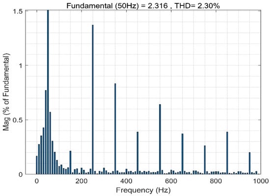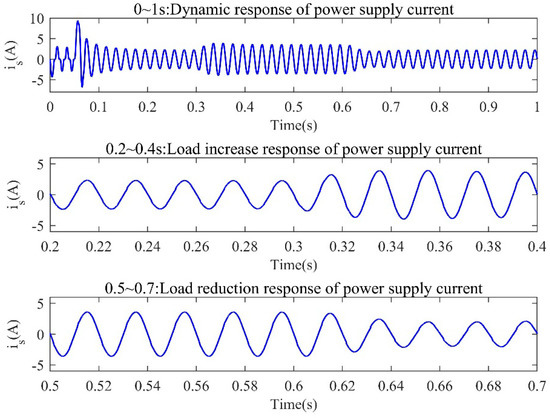 In the dynamic simulation, the APF was connected to the system at 0.05 s, and a nonlinear load was added at 0.3 s and subtracted at 0.6 s. In addition, the parameters of the increased load are given in Table 1. The dynamic response of the APF system was observed when the load changed. The dynamic response waveforms of the supply current using ASMC−NFNN is shown in Figure 13, which shows that no matter when the load was increased in 0.3 s or the load was decreased in 0.6 s, the power current returned to a sinusoidal steady state after a short adjustment, showing that the proposed controller worked well under load changes with good dynamic properties.