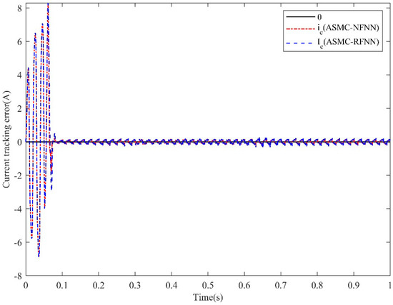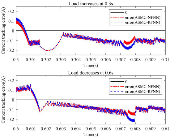 In order to see a more obvious comparison, the overall tracking error comparison curves are given in Figure 16, and the partial enlarged comparison curves at the load change point are given in Figure 17. It was clearly seen from Figure 17 that the error of the proposed method (red curve) at the two load change nodes was closer to 0 than the comparison method (blue curve). Therefore, the proposed controller with NFNN had better dynamic performance than the RFNN.