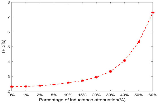 Figure 18 shows the change curve using ASMC−NFNN of the steady−state THD value with different degrees of inductance attenuation. When the inductance attenuation percentage was small, the THD hardly changed. When the inductance attenuation degree gradually became larger, the value and the change range of THD also increased continuously. This showed that the inductance parameter had a great influence on the system performance. However, it could be seen from the figure that even if the inductance was attenuated by 40%, the THD of the power supply current was still below 5% under the proposed method, which could still meet the application requirements. Therefore, the proposed method had a large tolerance space for inductance parameters, and had good robustness in terms of inductance parameter changes.
