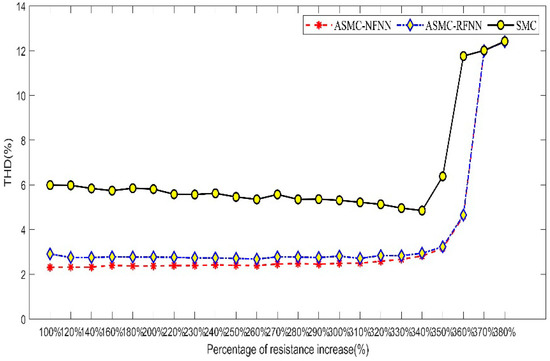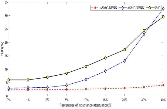 In addition, the steady−state THD comparison chart of the three methods under inductance attenuation is given in Figure 19, showing that the proposed strategy had the smallest THD variation and the best parameter tolerance. The method based on ASMC−RFNN had a small THD change when the inductance attenuation was small; when the inductance attenuation was greater than 5%, the THD increased sharply; after the inductance attenuation was 30%, the THD even exceeded the ordinary sliding mode controller. The above shows that when the inductance attenuation was greater than 30%, the RFNN network of the ASMC-RFNN method fell into disorder and failed to learn the system parameters correctly. At the same time, it proved that the NFNN had a better learning ability and adaptability than the RFNN. On the other hand, when the inductance parameters were not particularly large, the proposed algorithm with the NN had greater tolerance to inductance parameters and a smaller THD change trend than ordinary sliding mode controllers, showing the advantage of good robustness.