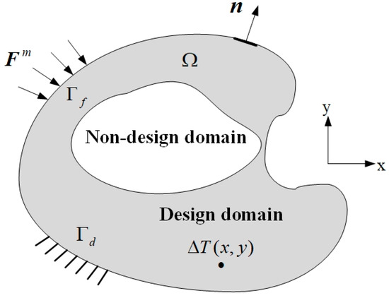 Figure 1 depicts a generalized two-dimensional thermo-elastic structure consisting of non-design and design domains. A displacement boundary condition, Γd, and an external mechanical load, , are presented. A uniform temperature variation field, ΔT, is specified in the design domain that generates thermal load. The design domain needs to be discretized into a finite number of elements.