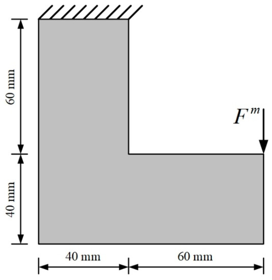 The first example considers the classical 2D L-shaped beam optimization problem, the most frequently considered test example in topology optimization. The geometric dimensions and boundary conditions are shown in Figure 3. It can be seen that the most prominent feature is the corner in the structure, which may lead to a certain stress concentration around the corner, which may be the problem that needs to be solved for stress-constrained topology optimization for thermo-elastic structures. The thickness of the design domain was set to 1 mm. The top left side of the L-shaped beam was restrained, and the upper right corner was subjected to a total load of Fm = 400 N. To avoid stress concentration near the load position, the concentrated load was equally distributed to the five adjacent nodes in the upper right corner. The structure was divided into 6400 four-node quadrilateral elements, and the maximum number of optimization iterations was set to 200.
