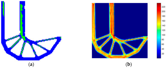 Considering the effect of different stress constraints, the topology optimization results for a stress constraint of 280 MPa are given in Figure 7. As the stress constraint value increased, the overall stiffness of the structure decreased, did the proportion of material C. The design volume also decreased from Table 2, relative to the stress constraint value of 235 MPa. The single-material thermo-elastic structure topology optimization results obtained by Deaton et al. [34] are shown in Figure 8. We can see that the multi-material optimization results can avoid stress concentrations more effectively and have a more uniform stress distribution by comparing Figure 5 and Figure 8.