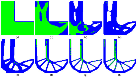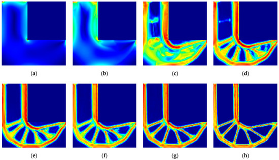 The topological evolution with material distribution field for ΔT = 50 °C: from (a–h). (a) Iteration 10; (b) iteration 20; (c) iteration 30; (d) iteration 40; (e) iteration 60; (f) iteration 90; (g) iteration 130; (h) iteration 200.