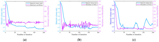 Figure 11 gives an iterative history of the volume ratio and maximum stress value for the L-shaped beam under three different temperature variations. The final volume fractions and the maximum von Mises stress values are listed in Table 2. As can be seen from Table 2, the target volume fraction of the optimized structure increases as the temperature change ΔT is enlarged, which clearly illustrates that the target structure requires more material to guarantee the effect of the higher thermal load. It can also be seen that the maximum stress value of the final topologies obtained from the minimized volume optimization model based on the stress constraint is always within the prescribed limit, and the final iterative process tends to be converged.