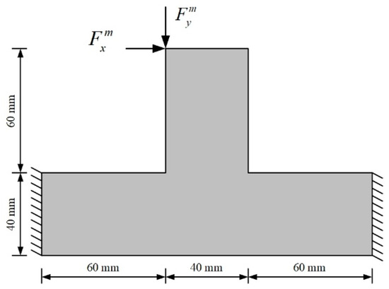 The second example considers the T-shaped beam problem with the design domain and boundary conditions shown in Figure 12. The left and right sides of the structure are fully constrained, and the top-left point is subjected to a concentrated load = 500 N in the x-direction and = 400 N in the y-direction. The selected steel material, with a yield strength of 235 MPa, and the structure, were discretized into 8800 four-node quadrilateral elements.