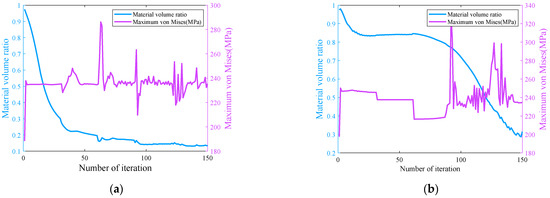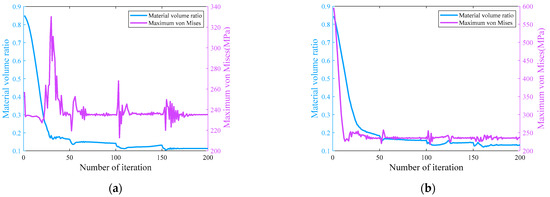 Figure 19 shows the iterative process for volume fraction and maximum von Mises stress at ΔT = 5 °C and ΔT = 30 °C, respectively. Table 4 demonstrates the final volume fraction and maximum von Mises stress. It can be seen that the minimum volume fraction increases significantly for increasing values of ΔT to make the structural strength meet the increased thermal load, whereas the maximum von Mises stress is maintained at the stress constraint limit.