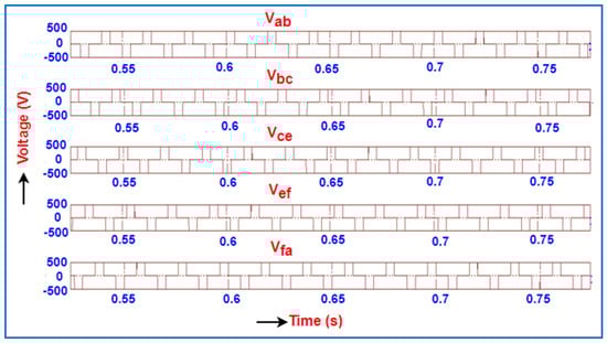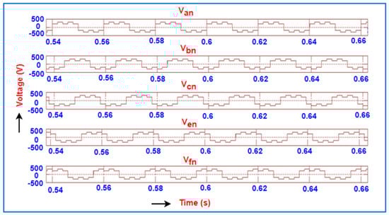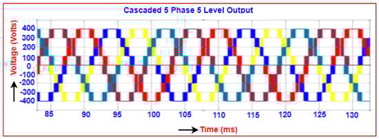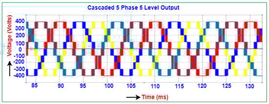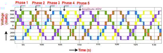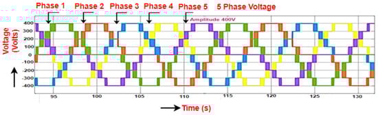 The productivity voltage of a five-phase DC to AC converter is produced by modeling inverter-based upon 72-degree phase displacement. The line voltage is depicted for all the five phases of the inverter, starts from zero, and has a maximum value of 500 V to a minimum value of −500 V as illustrated in Figure 2. The phase voltages for all the five phases of the inverter starting from zero and having a maximum value of 290 V to a minimum value of −290 V are illustrated in Figure 3.