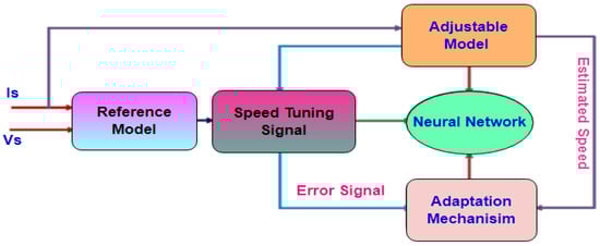 An input and output model is present for the MRAS depending on the strategy depicted in the foregoing section. However, if a neural network changes the statistical approach, a greater exactness and robustness can be obtained, as demonstrated in Figure 4. The separate PI controller can also be dropped out in this way since this can be interspersed into the neural network-based adaptive device. An artificial neural network (ANN) on a fuzzy neural network is one of the frames of the neural network-based model.