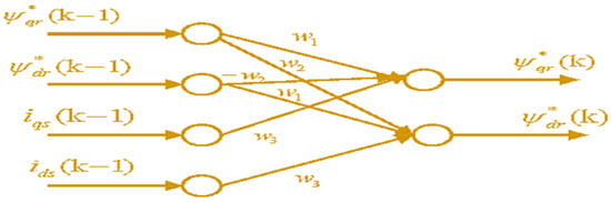 There is a probability of using divergent types of speed adjustable signals. Some of these selections offer high precision and are correspondingly vigorous to parameter modification. The adjustable model and mechanism of adaptive with a controller in the previous methods of MRAS can be exchanged by two-layer ANN. The proposed MRAS techniques are very delicate to parameter deviations and low-speed regions. The modified artificial neural network model is depicted in Figure 5. The estimated flux of the reference model is compared with the ANN-based adaptive model. The error is processed through the adaptation mechanism until the error becomes zero.