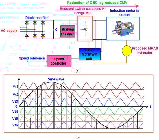 (a) Proposed induction motor traction drive using modified ANN based MRAS-methodology; (b) multicarrier modulation scheme for five phases.