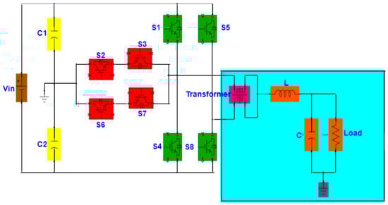 A 5 level T-type topology using eight bidirectional controlled switches S1–S8. One autotransformer with windings N1 and N2. In this proposed inverter, the voltage levels are in sequence of +Vin/4, +Vin/2, 0, −Vin/4, −Vin/2. The proposed topology consists of 8 MOSFET switches, 2 RC filters, a linear transformer, and an R Load.