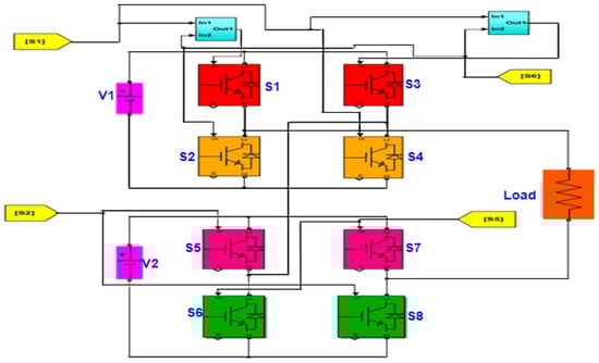 The cascaded H bridge is created with four switches and is depicted in Figure 9. H-bridge topology is more favorable than diode clamped topology because a greater number of diodes are used, which also affects the cost of the inverter. The switching states of the cascaded H-bridge multilevel inverter are depicted in Table 4.