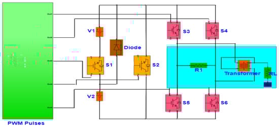 The supply voltage is given to the MOSFETS through the filters, and the transformer is connected between switches and R load for isolation. The CMV was measured among the system load and neutral points.