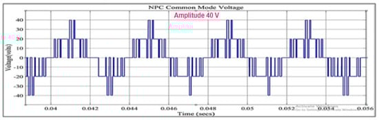 The output voltage of NPC multilevel inverter is 400 V in amplitude for the 400 V input voltage, and the common-mode voltage is 40 V in amplitude using sinusoidal pulse width modulation techniques and 20 V amplitude using multi-carrier sinusoidal pulse width modulation techniques as depicted in Figure 14, Figure 15 and Figure 16. The common-mode voltage of NPC multilevel inverter has less amplitude compared to the conventional two-level inverter and T-bridge multilevel inverter.