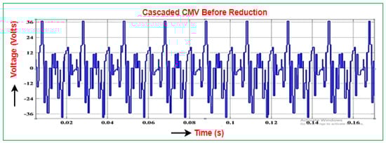 The output voltage of 8 switches five-level cascaded H-bridge inverter is 400 V in amplitude for the 400 V input voltage, and the common-mode voltage is 36 V in amplitude using sinusoidal pulse width modulation techniques and 10 V amplitude using multi-carrier sinusoidal pulse width modulation techniques as depicted in Figure 17, Figure 18 and Figure 19. The common-mode voltage of 8 switches five-level cascaded H-bridge has less amplitude compared to the conventional two-level inverter and T-bridge multilevel inverter and NPC multilevel inverter.