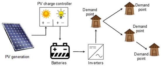 Currently, access to electricity remains a critical issue for around 1.1 billion people worldwide, generally affecting those living in rural contexts, where poverty levels are high. Indeed, both aspects (energy access and poverty) are closely connected, as proved by the Seventh Sustainable Development Goal stated by the United Nations (“ensure access to affordable, reliable sustainable and modern energy for all”) []. This goal explicitly views access to energy as key to improving the living conditions of the most underprivileged populations, “a backbone of any modern economy” []. In this sense, several recent studies highlight the fact that electricity access is linked to increased incomes and productivity (different to agricultural activities []), as well as benefits in education (increased study time) and health (decrease in respiratory diseases due to lower kerosene usage) []. In order to improve electricity coverage, the extension of the national grid has been the main strategy for providing access to electricity. However, in areas with rough topography or remote population centers, the expansion of the national distribution grid may become infeasible []. In those cases, the development of off-grid electrification systems and microgrids is among the most economical solutions and has been successfully adopted in many practical frameworks []. Besides this, for such stand-alone generation systems, the current concern about global warming and the resulting interest in alternative energy sources have led to the intensive use of renewable resources. In particular, solar energy remains one of the most widely employed sources [].