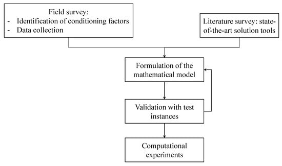 Since optimization approaches have proven their effectiveness in the framework of electrification system design [], a mathematical model for stand-alone electrification systems, including the considerations analyzed above, is introduced in this section. The mathematical formulation proposed in this work includes parts of the procedure presented in [] and further accounts for all the conditioning factors described in the previous section. The proposed method for the development of the mathematical tool introduced here is shown in Figure 2.