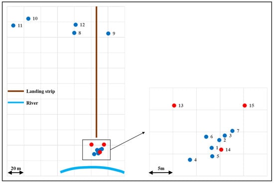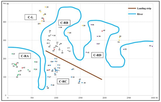 Then, the geographic coordinates of demand points and potential generation locations at each community are defined, implicitly determining the distances Lpd between points p, d ∈ P. Additionally, the specific obstacles at each community allow MPC to be deduced, and thus the set of neighboring points (p, d ∈ P). Suraka consists of 12 demand points (9 houses, 2 communal centers and 1 school) and 3 potential generation locations for microgrids (points 13, 14 and 15, see Figure 4). Santa Rosa has 15 demand points (12 houses, 1 communal center, 1 school and 1 waiting room for air passengers) and 4 potential generation points (points 16–9, see Figure 5). Finally, Conambo is a wider community, having 60 demand points (48 houses, 1 communal center, 8 school classrooms, 2 community canteens and 1 waiting room close to the landing strip) and 6 potential generation points (points 61–66, see Figure 6). Note that in Figure 4, Figure 5 and Figure 6, red points represent potential generation points, non-red points are for demand points, and the brown lines stand for landing strips.