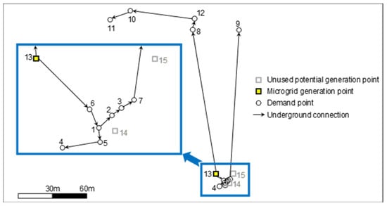 Moreover, as explained in point (a) of Section 2.3, MEER’s policy prioritizes microgrid-based designs over individual systems. Therefore, configurations including microgrids will be preferred even if their cost is up to α% higher than individual supply systems. Practically, the cost associated with all the items belonging to a microgrid will be multiplied by 1/(1 + α/100), which is equivalent to reducing the corresponding cost by a factor α/(α + 100)%. The generation costs of individual systems (at demand points) can easily be distinguished from those of microgrid configurations by defining microgrid generation points as no-demand points. With regard to α, the MEER proposes 20%, but the influence of this value is also studied through a sensitivity analysis (see next section).