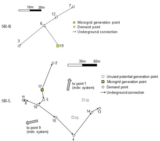 - Right side (SR-R), with 4 demand points and 1 potential generation point.