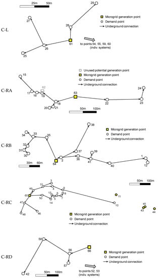 First, for every sub-problem, different configurations are determined depending on the value of α (see Table 5), proving the versatility of the formulation developed, which is capable of adapting to user’s preferences regarding microgrid or individual systems. However, apart from this global conclusion, different behaviors emerge from a closer analysis. For the Suraka and C-RA sub-problems, a microgrid involving all demand points is determined when α = 0 or 20%, while all users are supplied by individual systems when α = −20%. A comparable trend is observed in SR-L and C L (one-microgrid configuration when α = 0 or 20%), but, in these cases, some demand points located far away or isolated by obstacles are supplied by individual systems. In contrast, a different trend is observed in the remaining instances. For SR-R and C-RD, the minimum cost configurations only involve individual supplies when α = 0 or −20%, while microgrids are proposed for α = 20%. These microgrids may include all users (SR-R) or exclude users isolated by river meanders (C-RD). Finally, C-RB and C-RC further demonstrate the versatility of the computational tool developed, which proposes three different configurations according to the α value. When α = −20%, all users are supplied through individual systems; when α = 0, a combination of individual supplies and one microgrid is designed. The previous microgrid is expanded when α increases to 20%, including all users for C-RB and part of them for C-RC.
