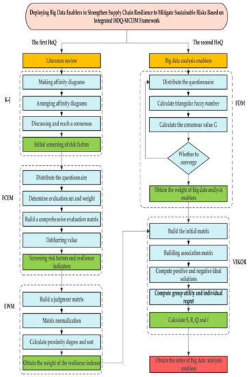 In recent years, QFD has been successfully applied to solve multicriteria decision-making (MCDM) problems in many fields, such as for selection of knowledge system [28], evaluation of green buildings [29], evaluation of bike-share project [30], priority of technology attribute [31], and reduction of fashion risks [32]. However, not much of the literature combines multi-attribute decision-making with HoQ. Therefore, this study aims to develop an integrated architecture to screen out the enablers of resilience indicators and big data analysis in the manufacturing supply chain to reduce the supply chain risk covered by the enterprise, and investigate the relationship between these three sets of variables (sustainable supply chain risk, supply chain resilience, and big data analysis). One of the highlights of this study is the identification of key big data enablers to strengthen supply chain resilience by the integration of two-stage House of Quality and MCDM methods to reduce or mitigate sustainable supply chain risks.