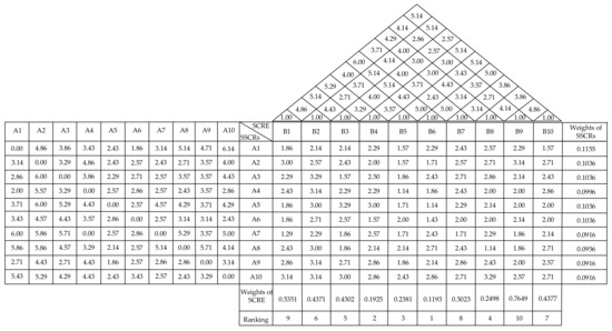 - Determination of index attribute matrix A: The index attribute matrix A is obtained by multiplying the index weight and translated standard matrix R; the result is ranked. The equation of the comprehensive score is as follows: