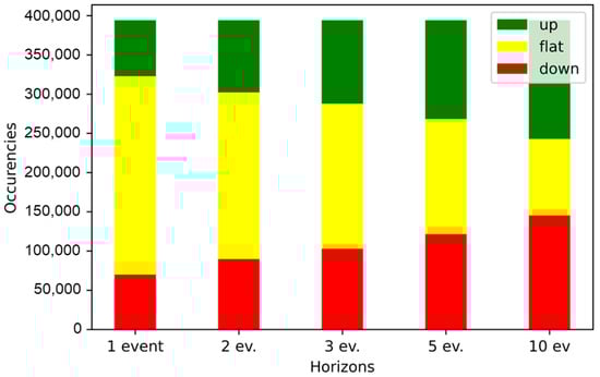- The dataset is inherently unbalanced among its three classes of movement (“upward”, “flat”, “downward”). As we can see from Figure 3 the “flat” class is dominant for the prediction horizons of 1, 2, 3 events. With the increasing length of the prediction horizon the proportion of the “flat” class is gradually shrinking, so for the prediction horizon of 5 events the dataset is more or less balanced between the three classes, while for 10 events the “flat” class is positioned as the smallest one. This requires appropriate adjustments to the experimental setup, such as over-sampling, under-sampling and etc. Based on the review of prior studies, some of the results reported were based on experimental procedures that did not include dynamically responsive sampling of datapoints; this could have potentially biased such results.