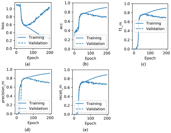 - Save the best weights of the model achieved during the training. Functionality in many Python machine learning libraries, including TensorFlow, enables the saving of the best weights of the model achieved during the training based on the selected metric performance. For example, as can be seen from Figure 6, if the condition for saving the model weights was the maximisation of the validation accuracy, the weights from somewhere around epoch 50 would be taken as the best. Thus, likewise for an early stopping mechanism the model would not suffer from over-fitting.