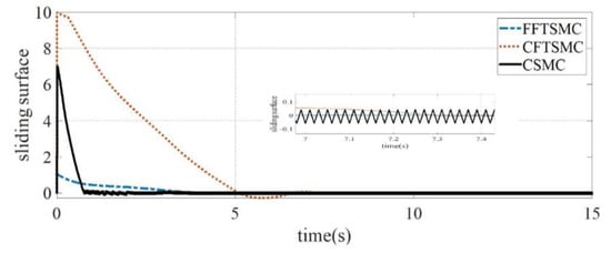 The proposed approach is compared to the classic fast terminal sliding mode control (CFTSMC) method [39] and classic sliding mode control (CSMC) [21,40], which considers the control of spacecraft electromagnetic docking and DC servo motor. The dynamics of the sliding surfaces for all three approaches are depicted in Figure 3.