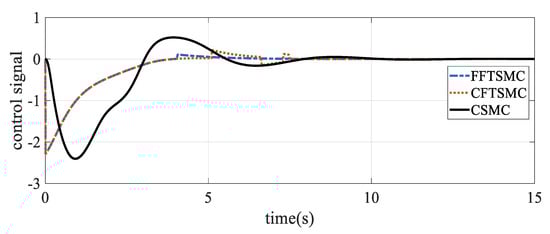As shown in Figure 3, the chattering related to the sliding surface and overshoot are reduced by using fuzzy. The control signal is shown in Figure 4. The control signals for all three approaches are shown in Figure 4. Note that the (FFTSM) control signal is simpler and has less oscillations.